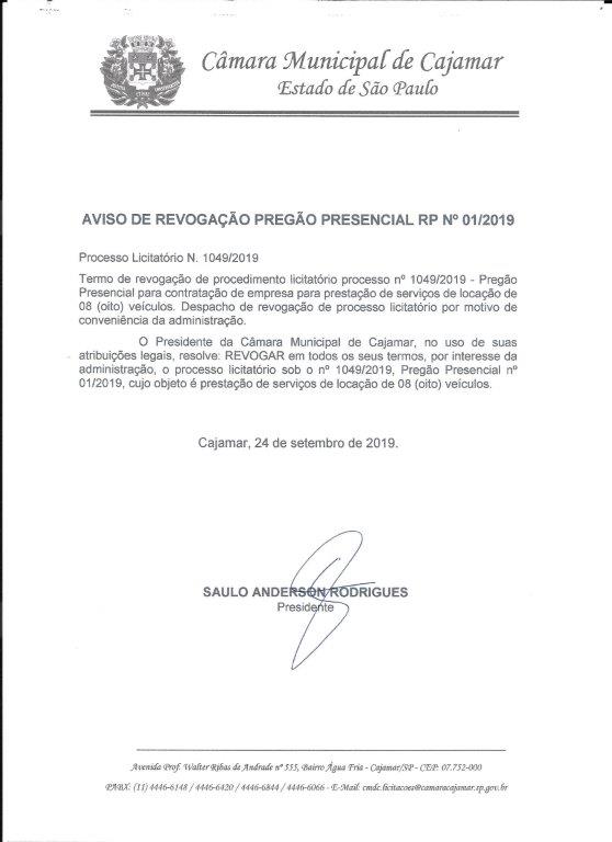 REVOGAÇÃO Proc. Adm. nº: 1049/19 – Pregão Presencial nº 01/19